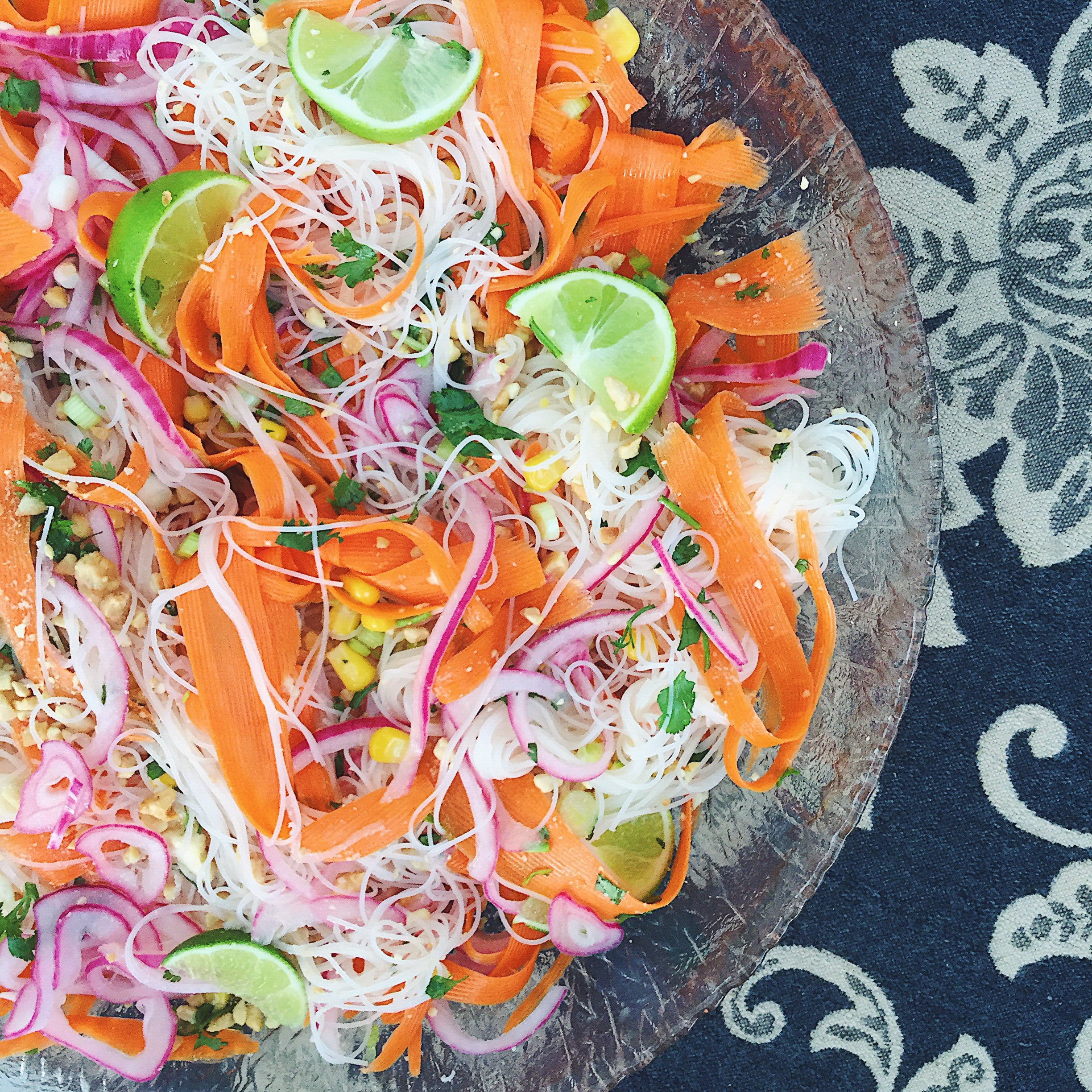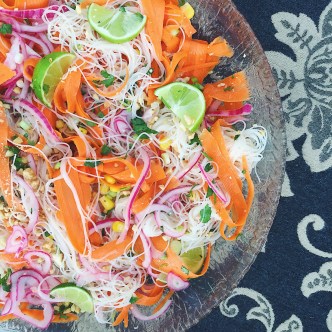 review. The first thing I noticed when cooking from this book is that the suggested serving sizes are quite small (2-3 servings), however I was able to quite easily double (or triple) the recipes in order to accommodate the 5 adults and 1 toddler I was cooking for. My dad and sister kindly obliged my request to choose the first recipes I would try. It was the rice noodle salad on the front cover that caught my dad’s attention so that was one of the first dishes I made. The Zingy Carrot and Noodle Rice Salad (p. 155 — pictured right) was amazingly delicious — the ribboned carrot gets “pickled” by the heated dressing and when added to the final dish really add to the overall flavour and texture. The crunchy, tangy carrots paired with the sweet corn, and the chewy, mild rice vermicelli, along with the cilantro and lime really make for a beautiful and non-lettuce based salad that was a clear favourite with my family. But really who am I kidding? They have absolutely loved all the recipes I’ve made from Izy’s book. Even if you’re a “meat eater” (as my dad puts it) you can easily incorporate these recipes into your Meatless Monday routine or even add meat to the dishes if you’re so inclined (or maybe you’re looking to eat less meat). I know my mom, dad, and sis — all non-vegetarians — felt completely satisfied after every meal. Nothing fad-y or strange just great cooking.