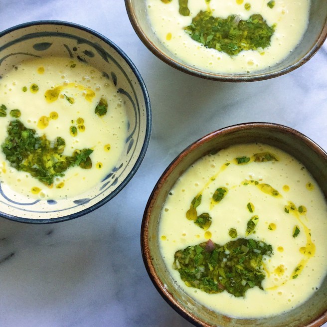 It’s summer and corn is bountiful! My way of preparing it — steamed with salt and butter. Boring but it seems to be the way my husband and daughter enjoy it the best, until they saw the pile of corn that was de-kerneled sitting beside my big soup pot. There were complaints but I assured them that this recipe of Nosrat’s — Silky Sweet Corn Soup — would be worth the change. So I boiled up the cobs to make the stock, then heated the butter to cook the onions (which I cooked until blond). Blond? Something I had never heard of and never gave cooking onions much thought. But thought is needed with knowing how to cook/when to apply which technique and she left me feeling released from the notion that there is only one way to cook an onion — as she says, [Y]ou don’t need to caramelize every onion you cook. Then I sauteed the kernels, added the stock and seasoned with salt to enhance the flavour. If the soup is too sweet she directs you to add an acid to balance the flavour. The resulting soup was as incredible as the ice cream I ate 5 years ago! The flavour so layered, it’s almost indescribable. We tried the soup both chilled and heated garnished with her Mexican-ish Herb Salsa.