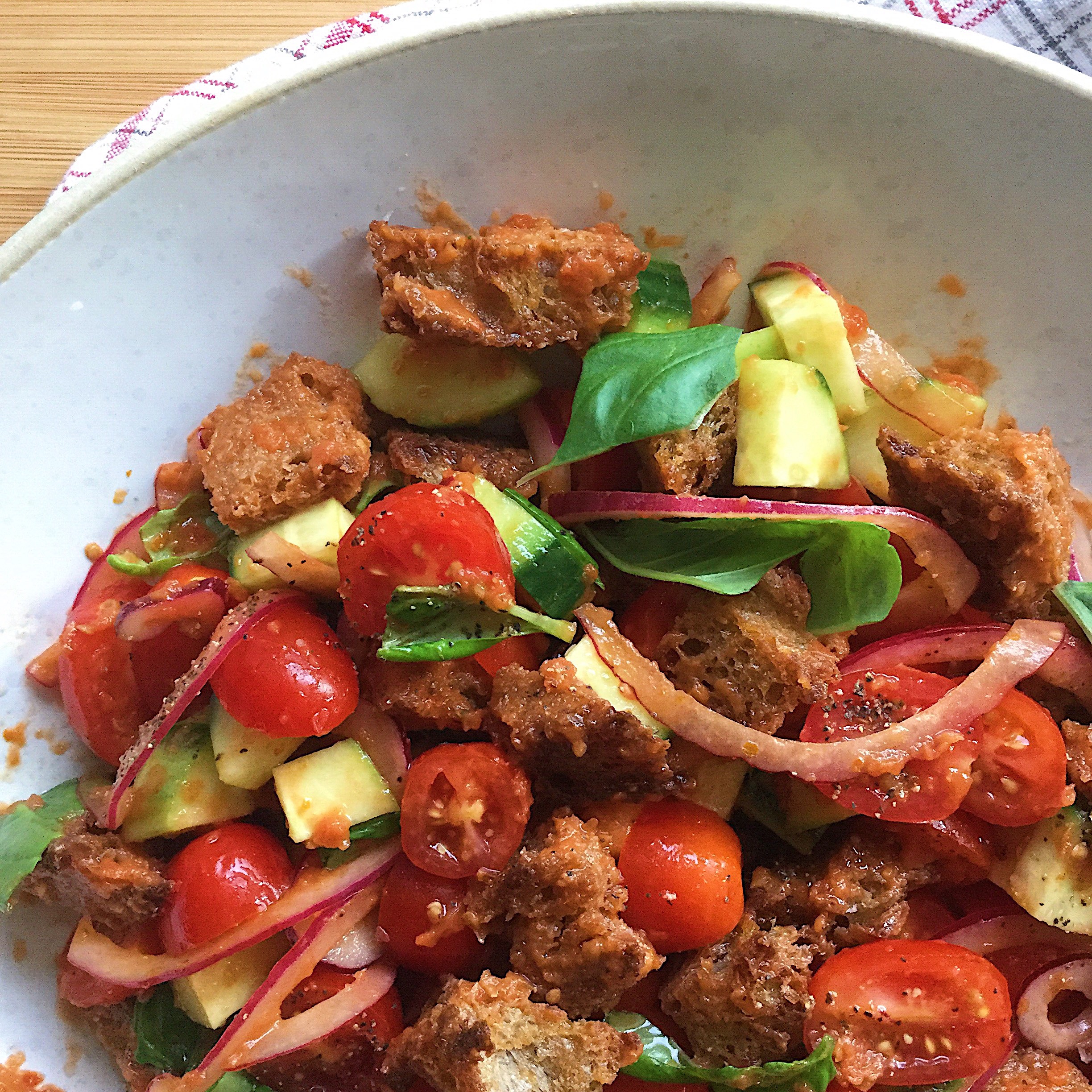 Nosrat is 100% correct when she writes: Store-bought croutons simply can’t compete with homemade ones. Word. I think it’s the texture and the flavour. No tooth-breaking or dried out old bread — just the most wonderful Torn Croutons. I made them for her Summer Panzanella — Tomato, Basil, and Cucumber. We enjoyed this panzanella so much that we had it three times over four nights! Partly it was because of the croutons, partly because of that memorable Tomato Vinaigrette — the dish was such a celebration of fresh summer ingredients. Again, nothing complex only beautifully and simply prepared food. I felt confident to change it up after the first try by adding black lentils and some feta cheese. This is what begins to happen as you learn, you take small steps and become more spontaneous with your cooking.