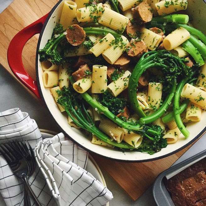 The menus are organized into three sections — Brunches, Lunches, and Dinners — with food and drink ideas that are tasty but that any home cook is capable of making (writing this I am reminded of that scene in Bridget Jones where she’s making the leek soup and somehow turns it blue! Don’t panic J&L have made their recipes so that you’ll be successful). The beauty of this book is that it removes the need to source recipes from different books by offering menus full of recipe that complement each other and support a theme. I also enjoyed the fact that they choose unexpected recipes for some themes. Take the Movie Night theme — instead of using the easy movie night go-tos like pizza and popcorn they have offered an easy but elegant pasta dish finished off by some really gorgeous Salted Caramel Brownies. The snacking option is some highly addictive Spiced Nuts that you’ll most likely have to hide so that you don’t eat them all before the guests arrive. This is not a vegetarian or vegan-based book so with the Sausage, Broccoli & Fennel Pasta I substituted meatless sausage for the pork ones called for in the recipe. While the meatless sausage was easy to brown they didn’t seem to keep their browned appearance when I added the wine so I would suggest adding them in at the end if you’re partial to that. Otherwise, while not browned, the pasta dish tasted wonderful.