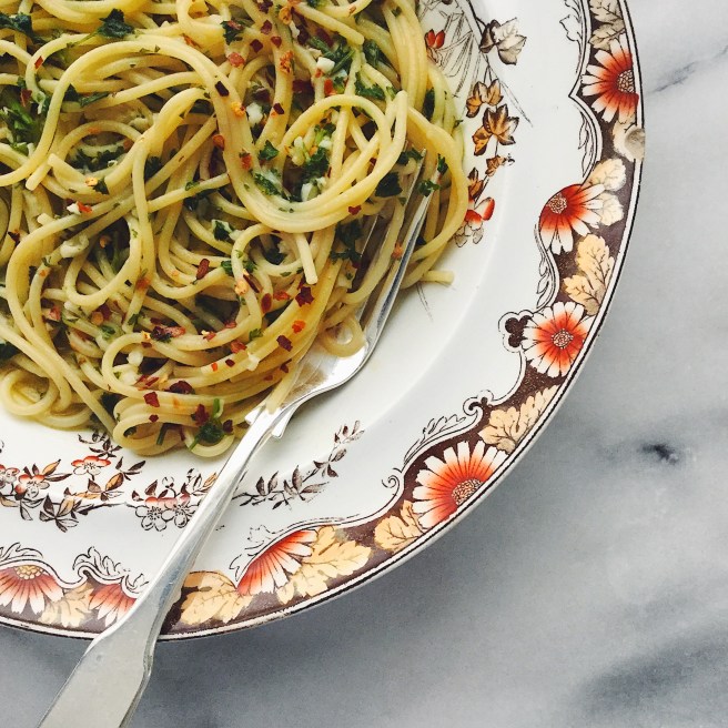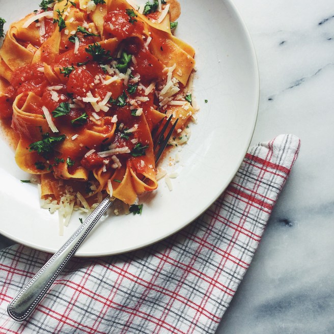 Of all the recipes in the book I was most eager to try some of the pasta recipes — I think one of my favourite parts in the book is when the plumber and his assistant come to fix her broken radiator and end up cooking her dinner. Guido “the plumber” upon discovering she can’t cook, makes it his mission to show her how to properly cook a meal for herself. The ensuing Pasta con Pomodoro sets her on a new culinary journey — one without pre-packaged food or any additives. When I made this for my family one Saturday it was an instant hit! I heeded Guido’s advice and used a large pot to boil my noodles (“they need to move around” afterall!) and when I was finished making the sauce the resulting dish was one that my four-year-old adored. It took no more time to prepare than her standby boxed macaroni and cheese favourite but it was made from scratch. No pouch of cheese powder either and it’s times like this I am reminded that a good meal isn’t one that is full of ingredients or takes loads of time to make. It can be as humble as Pasta con Pomodoro — it’s all about taking the time to nourish yourself through the careful and mindful preparation of the meal.