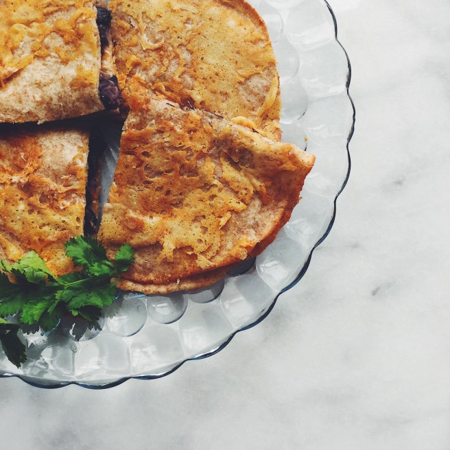 One of the surprising things about this cookbook was how tasty all of the recipes I tried are. I guess I had assumed that the emphasis would be placed on the theme not on the food but Starr really presents some delicious recipes that I’d definitely make again. The black bean patty for the energy sandwich had some really good seasoning — sage, thyme, ground mustard — that made me think of the meaty, sausage version I used to enjoy before I was a vegetarian. I also learned that when you make quesadillas if you butter the sides of the tortilla that will touch the pan, then press parmesan into the butter, when it cooks it will develop an insanely, crunchy crust! The extra texture here really adds to the quesadilla (I’ve since been told that you can use this same technique for grilled cheese sandwiches).