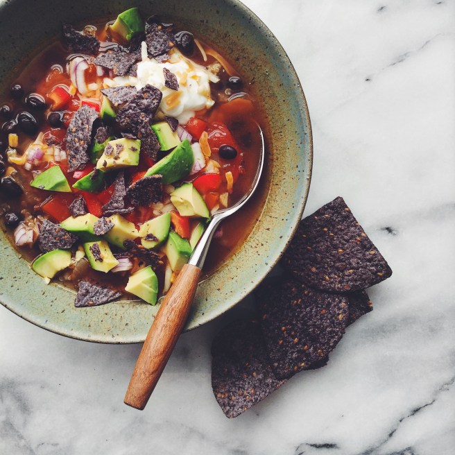 The book is divided into 8 sections — Nibbles, Starters & Small Meals, Soups & Salads, Chicken, Meat, Fish & Shellfish, Vegetable Go-Alongs & Go-Alones, Desserts, and Basics & Transformers. Since she and her family eat a varied diet (and the book focuses on how she cooks for her family) there is no special mention of other diet types — vegetarian, vegan, gluten free, etc. Since I’m cooking for my very vegetarian family I found many recipes that suited my purpose and there were even a few recipes that could satisfy vegan or gluten free diets (in some cases with slight substitutions). Her Bean and Tortilla Soup can be vegan if you omit or substitute for the cheese and yogurt used to garnish the soup (it’s already gluten free). I really liked this recipe because during the cooler months a hearty soup like this is simple to prepare and feels so very comforting (it’s also great because it allows each person to customize their soup with what they add to garnish — cheese, yogurt, tortilla chips, fresh diced onion and bell pepper, cilantro, a squeeze of lime, a dash of hot sauce, avocado — the possibilities are almost limitless).
