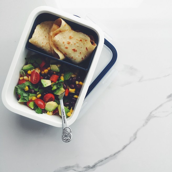 When it comes to packing a lunch (especially in my daughter’s case) texture is key — nothing that may be “slimy” or “gross.” Having this in mind I start to look at recipes where the texture will remain — such as Day’s recipe for Black Bean Salsa Salad w/ Homemade Crepe Tortillas. Beans are such a great choice to pack in a lunch because they keep their texture, taste ok at room temperature, and taste great when paired here with avocado (creamy texture is ok!), crisp bell pepper, kernels of corn, and the sweet, with a bit of chew, cherry tomatoes. Adding in the crepe tortilla provides a fun element that is easy to eat with your hands (a great kid option for kids).