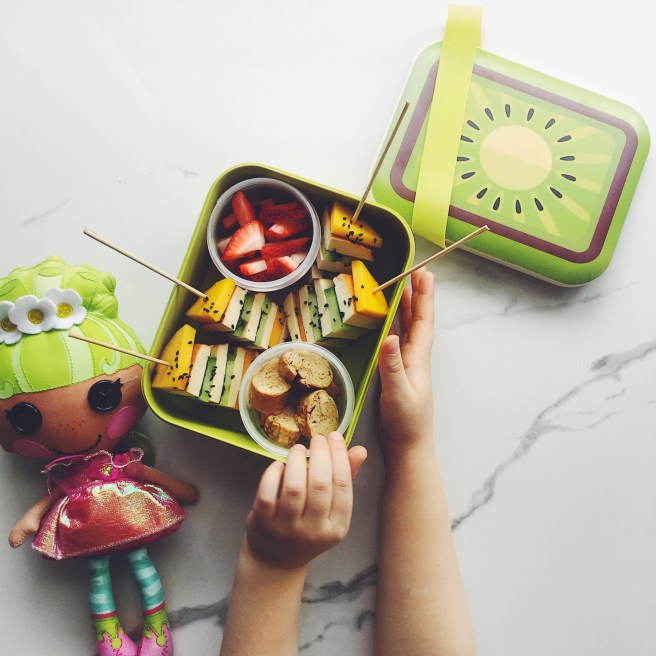 I can picture my first lunchbox now in all its glory: a canary yellow plastic lunchbox with a Cabbage Patch sticker on it and with a matching thermos inside. As a parent I can see the strategy in giving your child a cool lunchbox — it will make lunch exciting and make the food taste better (fingers crossed). Picky eating has never been a problem for me, so I was always glad to open my lunch and see all the goodies my mom packed. Being a late Gen-Xer I think my lunch looked pretty much like all the other lunches at my school — sandwich (most likely PB &J or some kids had bologna and mayo or plain cheese), carrot or celery sticks, cubes of block cheese (maybe some crackers), yogurt, an apple or banana, and my mom would always add little tins of rice pudding or tapioca. Then when I became a grade school teacher pretty much anything went in terms of lunches. Every shade of homemade or store-bought — I’ve seen it all. As an adult it would give me pain to see lunches go uneaten. Truly a labour of love for some parents because some kids just wouldn’t partake. Now that I’m a parent and my daughter is on the very cusp of schoolhood I’ve made it my goal to pack a lunch that she’ll enjoy.