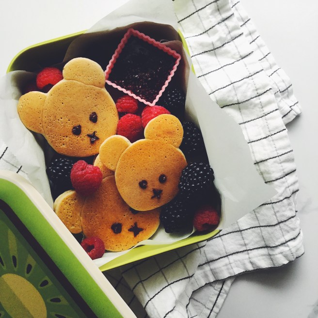 Back to my quest for building up my arsenal of lunch options for my daughter. First and foremost, I made the cutest, most kid-appealing lunch in the whole book: Fluffy Grain-free Pancakes w/ Overnight Chia Jam. What the recipe title isn’t telling you is that Kiyo Popowa has formed the pancakes into bears while cooking them and then added cute chocolate eyes and a mouth. All things my daughter enjoys eating and packed in a lunchbox making it even better! The pancakes themselves (being grain-free) are made of blended cashews, eggs, baking powder, salt, and water. So, while this recipe isn’t allergy-friendly for school consumption I’ll be using Kiyo Popowa’s idea but making the bear-cakes out of a nut-free recipe.