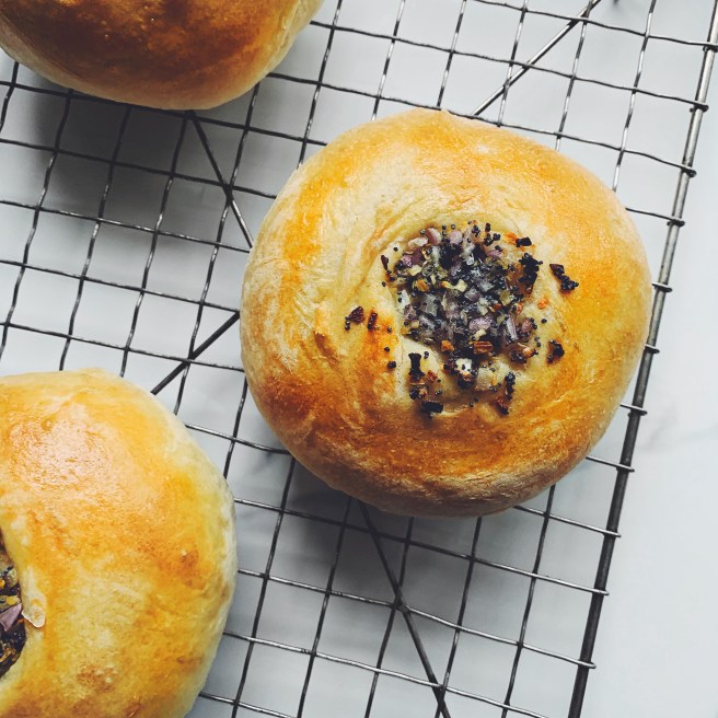 It was the picture of Rosen’s Bialys: Soft Onion Buns that stopped me in my tracks as I flipped through her book — golden and plump with a tiny dollop of baked onion and poppy seed. Those buns sitting on the cooling wrack looked so inviting that I decided to bake my own! As with the Kichel, making the Bialys is made easier using a stand mixer. Once you’ve let the machine do all the kneading then you cover the beautifully smooth dough to rise (the first of many rises the dough will go through). As with her other recipes, the Bialys didn’t disappoint — big and pillowy, they were only made better with a giant swipe of butter. As a side conversation, part of her recipe head notes mentions The Bialy Eaters, a book by Mimi Sheraton, in which she explores the history behind these iconic buns. Happy for any book to lead me on the path to learning about other great books what I found is that both Sheraton and Rosen show the lasting nature of the humble, delicious food and the importance of tradition.