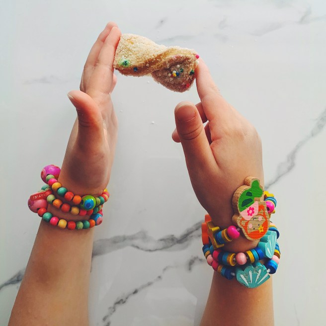 When my daughter chose Kichel: Rainbow Nothings (what she named the “Party Cookies” when she saw the picture) to make, I inwardly cringed a little bit because they a) took over a dozen eggs (in a combination of yolks and whole eggs) to make and b) I would need to watch my stand mixer beat the dough on low for about 20 minutes. Neither of which particularly appealed to me but, as I often find when I feel this way about a recipe, when I make the recipe it’ll turn out wonderfully and be one that I’ll keep making. Once the dough was rolled out and pressed into the sugar and sprinkles, I could see the look of glee and anticipation on my little one’s face. The resulting cookies are much more that the name implies — if you saw Katie bite into her first Kichel her face said everything. This light and crisp cookie covered with sugar and sprinkles was every bit the party that they looked, and I think it’s become the most requested cookie in my house.