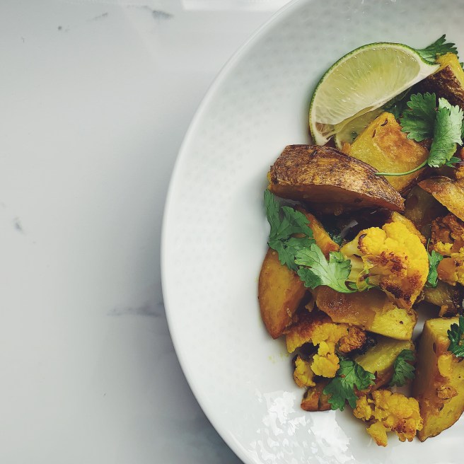 It feels like in every review I talk about the pack of cauliflower-haters I live with. When my daughter was learning to talk, some of those first words were used to describe her feelings on this vegetable “Mummy, this is horrible.” So, over the years I’ve looked for recipes to entice my people back to feeling a bit more love for this delicious (in my mind) ingredient. Enter Krishna’s recipe for Roasted Aloo Gobhi (Potatoes and Cauliflower), a recipe so wonderful and delicious I’ve made it (what feels like) a gazillion times. They can’t get enough of the oven-roasted potatoes and cauliflower seasoned with turmeric, cumin, asafetida, fresh ginger, caramelized onion, lime, and fresh cilantro. I always make a bit extra when I make this recipe so that I can enjoy it the next day for lunch.