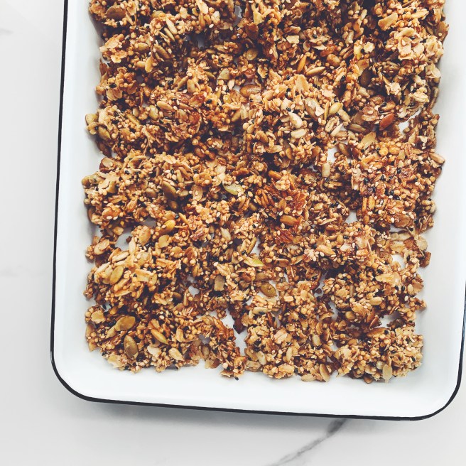 Recently, it was my friend’s birthday, and every year for her special day, she requests granola — which is great because she lives thousands of kilometers away and granola is such an easy treat to send in the mail. So, for this year’s birthday granola I chose to make her a batch of the Maple Cinnamon Granola from More Mandy’s. A nut-free granola, the “nuttiness” comes from sesame seeds, puffed quinoa, pumpkin seeds, and sunflowers seeds. The combination of maple syrup and brown sugar, along with the puffed quinoa and seeds, reminded me of Sesame Snaps (another wonderful, iconic Canadian treat!). The granola was so delicious, I made another batch for us to enjoy — which we did the next morning when I made the Mandy’s recipe for Chia Seed Parfait. Both my daughter and I love how chia seed pudding can be “dressed up” any way we like with a combination of fruits, granola, nut butters, etc. These parfaits make an excellent afterschool snack!
