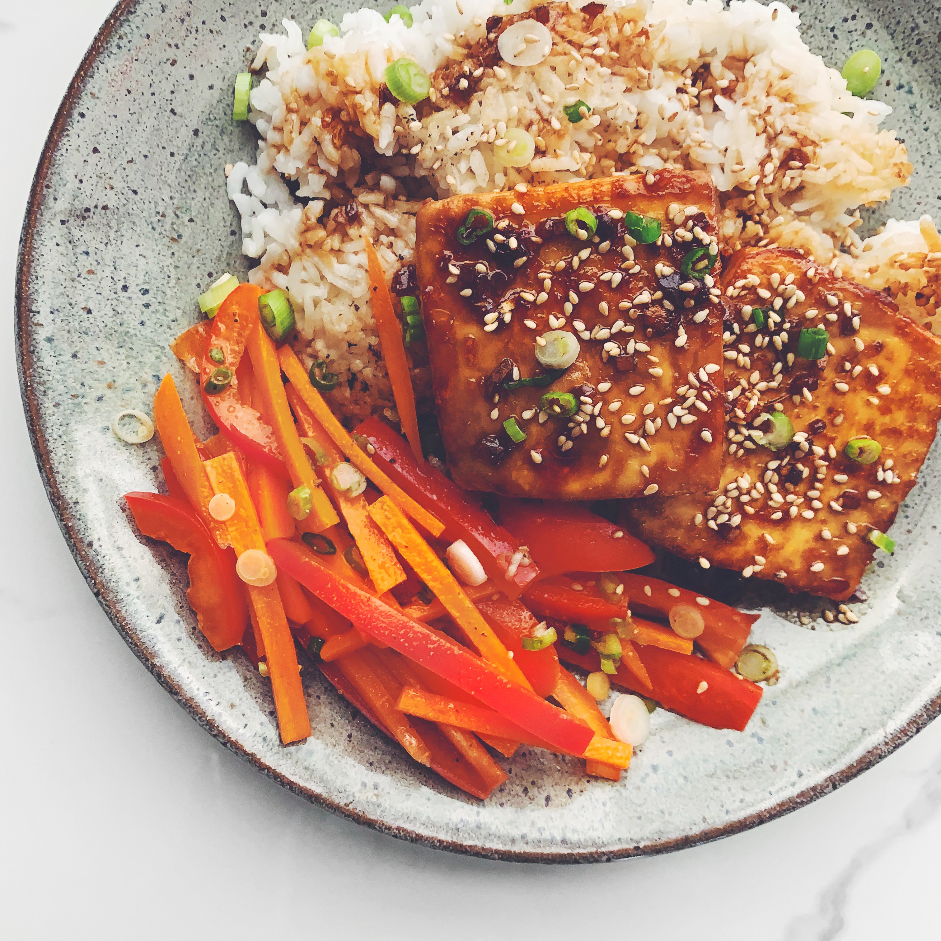 Since we’re such fans of Perelman’s tofu recipe from her last book, I decided to make her Soy-Glazed Tofu w/ Crisped Rice for supper. Here, the tofu is pan-fried until crisp, then it’s glazed with a mouth-watering sauce containing garlic, ginger, rice vinegar, black vinegar, and sugar. Served with crispy rice (which is achieved by browning pre-cooked rice in a skillet until crispy) and a crunchy slaw (here I used a combination of match sticked carrots and red bell peppers). I love when she ends her recipe head notes by asking us: “Matchstick vegetables tossed with a light, toasty dressing, glossy tofu, and crispy rice are so good together, I think we should make this once a week forever, don’t you?” (129)