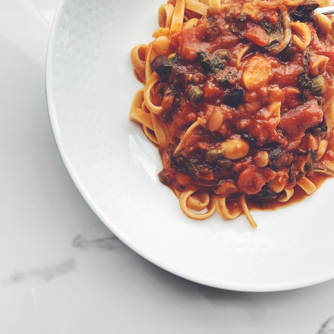 We’ve all had those nights where there is no set plan for dinner and, it was on one of these nights that I decided to give Hamshaw’s One-Pot Pasta with Olives & Capers a try. Here, all of the ingredients are put into a large pot then left to cook – so, instead of cooking the pasta and sauce separately, they cook together. I really liked the combination of kale, crushed tomatoes, beans, olives and capers – a slightly sweet/salty taste, with the flavours infusing the noodles as they cook.