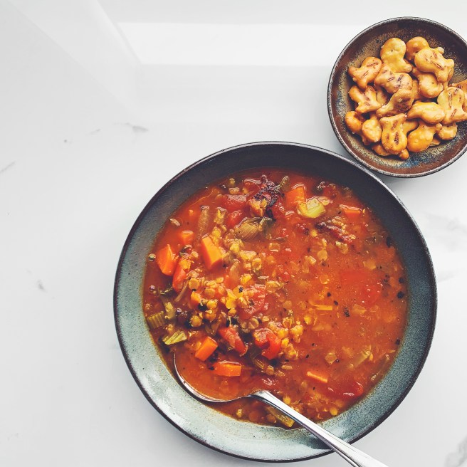 One of my favourite recipes from the book is for Lentil Soup. Like all good, hearty soups, this one begins life in a large Dutch oven, and, from there, carrot, celery and onion is cooked until softened. The flavours continue to build with the addition of garlic, cumin, coriander, turmeric, cinnamon, and red chili. The base is one of vegetable stock and canned whole peeled tomatoes which have been crushed, with the crowning glory – split red lentils – being the last to grace the pot. Served with lemon and a drizzle of olive oil, we enjoyed this soup with some crackers on the side. Not only deeply comforting and delicious, part of the magic of a soup recipe like this is that you’ll have enough for leftovers too!