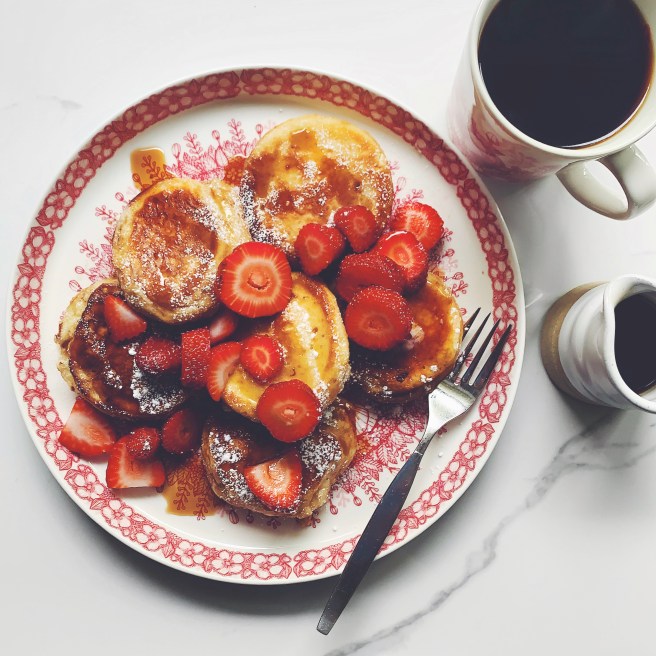 One of my family’s favourite food days is Saturday, for on Saturday mornings we often have pancakes. Slathered with butter, dressed in maple syrup, we sit together to talk, eat, and listen to the countdown on the radio. So, when I received Recipes in the Mail, I immediately connected with the story about Catherine Redman — Sweet memories of pikelets — about pikelets made by her grandmother and served with a “beautiful, finely cut fruit salad.” The recipe Redman shared with Minichiello was one that her grandmother used then passed on to her mother, and one Redman continued to use when her children were younger. There’s a lovely photo of Minichiello and her daughter Vivvy making the recipe too. The pikelets were scrumptious! Smaller than a regular-sized pancake, they were light and puffy. I served them with sliced strawberries, syrup, and butter.