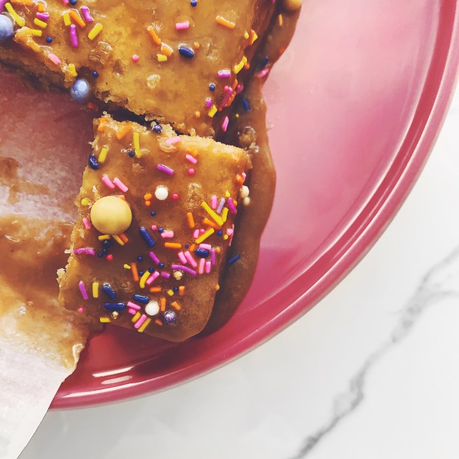 Part of the sweetness of Sung’s recipes are the stories and connections she shares in the recipe notes – baking her recipe for Vanilla Cake I thought about Sung’s Poh Poh (the recipe’s originator). She would bake the cake to include in tender care packages she would give to Sung during her first year away at university. I am a big fan of baking up a little love to share with people, so when I made this cake, I boxed up a few slices that I dropped off at a neighbour’s house. Keeping up connections and showing care for our friends and family through food is a wonderful way to pay tribute to people like Poh Poh who kept their loved ones nourished with recipes like this one. Instead of making the Coffee Icing Glaze (my neighbours have young kids), I tried making the Fudgy Caramel Frosting. For some reason (I think I didn’t cook the frosting long enough), the frosting didn’t set but even so, it still tasted delicious, and my neighbours really enjoyed it!