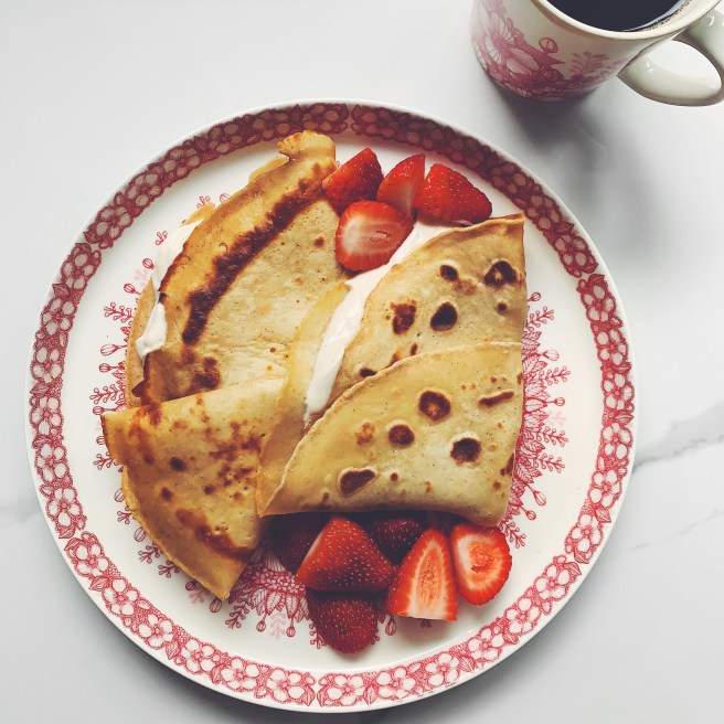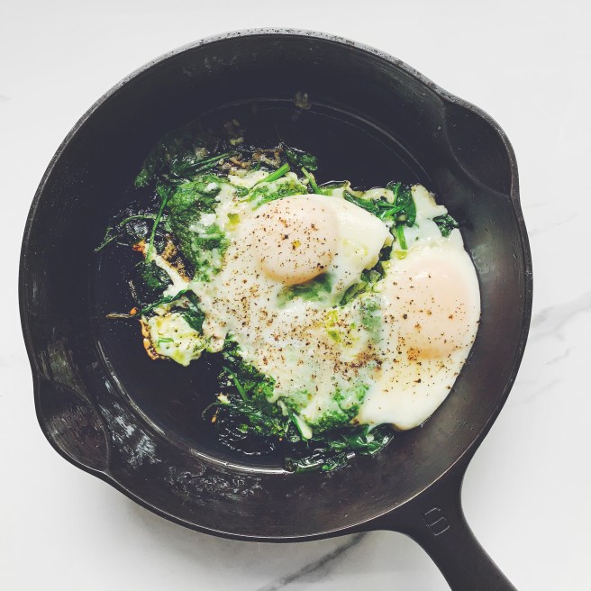 Maybe you’re wondering what my favourite recipe is – the one that I dream about? It would be Berg’s Green Eggs sans Ham! Spinach is cooked in a cast iron skillet, basil pesto is stirred in, then a couple of eggs are put on top. Served with some toasted bread, this is one of the easiest, most delicious breakfasts! I adore cooked greens (after making this recipe many times, I’ve found that using kale as a substitution for spinach works too) and, the pesto kind of ties it all together. This meal has transcended breakfast to include lunch and after school snacks (Katie will often enjoy an egg after school, and when I make a smaller version of this dish she says it feels “fancy”).