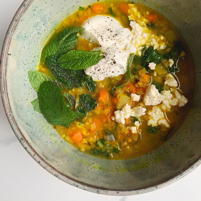 Now that the temperatures have dropped and the sweaters have come out, it definitely feels like soup season! To celebrate the best season (imho), I made a batch of Berg’s Lemony Lentil Soup. The base of the soup is bright, herby, and vegetal with lemon, mint, parsley, chopped carrots, onion, and leafy greens. While we like lentil soups, this recipe contains thinly sliced zucchini which I wondered if it would turn slimy in the broth. I worried for nothing because it cooked up well in the soup and really added to the texture. As suggested, I topped the soup with crumbled feta and a dollop of plain yogurt.