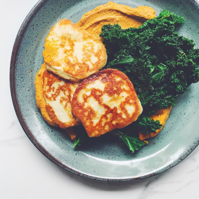 Another recipe that we love (that Katie wrote “fan favourite meal” across the top of the recipe in the book) is Pan-Fried Halloumi with Greens and Romesco. Romesco – a tomato and bell pepper-based sauce from Spain – is a great, no-cook sauce that tastes delicious with everything. For Berg’s version, she uses jarred roasted red peppers as well as oil-packed sun-dried tomatoes as the base. Then garlic, fresh herbs, toasted almonds, smoked paprika, lemon and olive oil are added to round out the sauce. It’s as flavourful as you can imagine, and it pairs really well with seared slices of halloumi (a type of Cypriot cheese) and cooked kale.