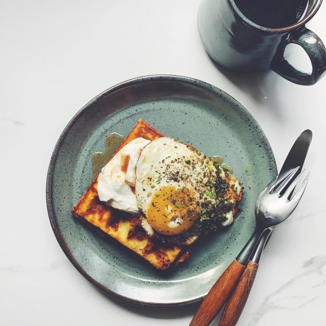 Can something be considered a “leftover” if you didn’t actually serve it to your family the first time around? While this may sound confusing, as I read the recipe head notes for their Pierogi Mashed Potatoes, I knew that I would 100% be making them only to then parlay the mashed potatoes into making the Pierogi Waffles. Growing up in a Ukrainian-Canadian family, pierogies were central to many meals my grandmother would make. Even my mum and aunt would get together once a year to have a pierogi-making bee so that all our pierogi needs would be met for the upcoming year. For those of you who are unfamiliar with the pierogi, they are potato-filled dumplings where the main flavourings come from potatoes, fresh herbs (chives and dill), caramelized onion, garlic, and sour cream; all of which are present in both Harris and Wesszer’s mashed potatoes and waffles. Since I wasn’t serving my family the mashed potatoes, I took the entire portion and made a double batch of the Pierogi Waffles. These are *the most delicious* waffles a person could eat – since I used butter to grease my waffle iron, the exterior of the waffles was crisp, golden, and buttery while the inside was cheesy and fluffy. I enjoyed mine topped with a fried egg, sour cream, and brown butter, and, these freeze so well that I was able to save some waffles for my mum, dad, and sister to try when they came to Halifax to celebrate my mum’s birthday (as a side note, they loved these waffles so much that my mum immediately purchased a copy of the book).