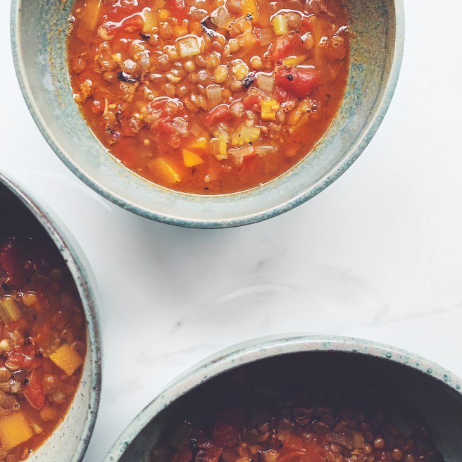 Another meal we enjoyed from the book was the recipe for Lentil Soup because it’s such a cozy meal – perfect for these chilly, damp winter days. With just a handful of ingredients – green lentils, diced onion, garlic, diced carrots and celery, and chopped tomatoes – this soup is easy to prepare and makes enough so that you’ve got leftovers for the next day. I served our soup with warmed rolls and butter, which was a huge hit with my husband and daughter.